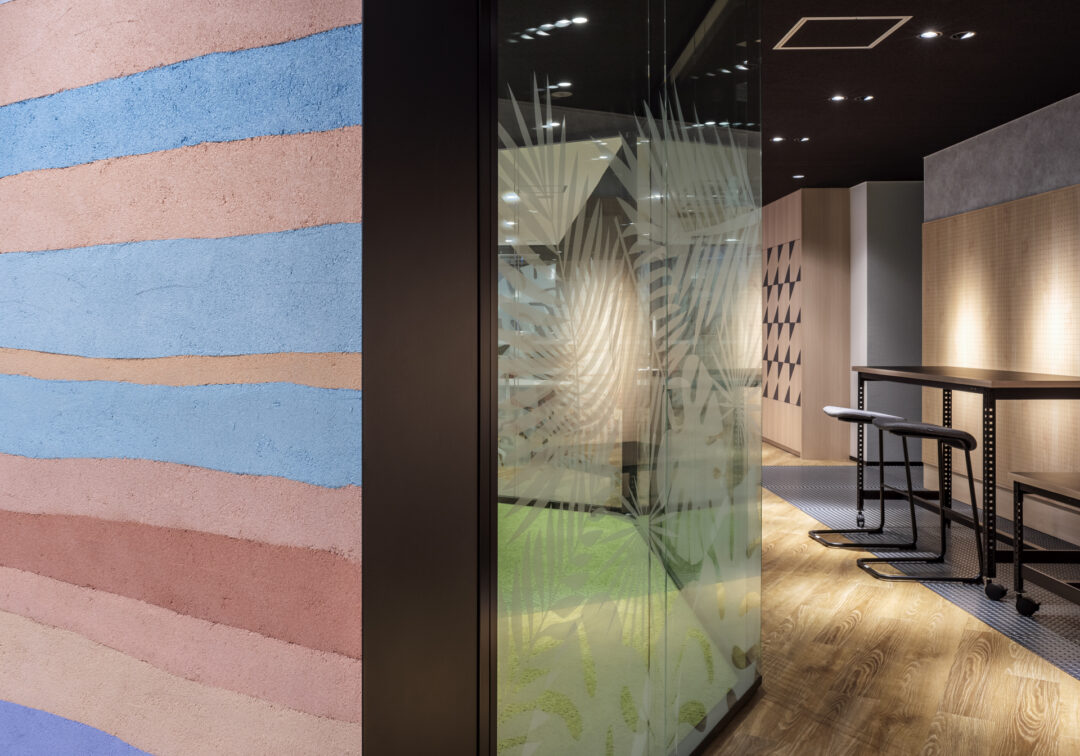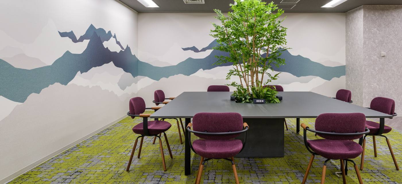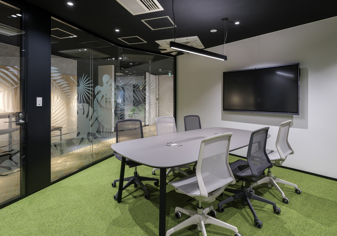 フロア中央に会議室を配置し、食べる場所と働く場所を物理的に分断せず、視線と動線で用途を切り替える構成とした。