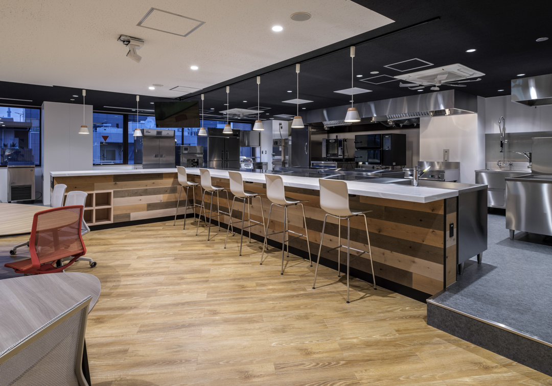 テストキッチン利用、打合せ、イベント開催など用途変化を前提に、家具をすべて可動式とし、人数・目的に応じて即座にレイアウト変更できる空間を構築。日常利用から非日常まで対応可能とした。