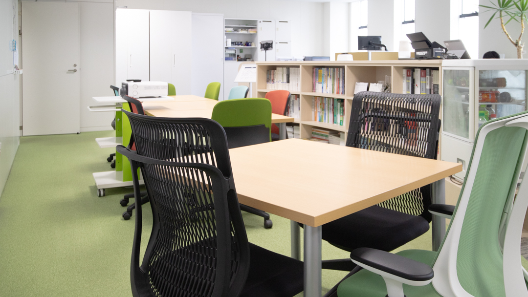 社員同士のアイデア創出や情報共有を活性化するために設けられた、多目的なオープンコラボスペース。部署や職種の垣根を越えたコミュニケーションが自然に生まれるよう、空間の構成や使い方に工夫を凝らしています。打合せや学びなど目的に応じて柔軟に活用できる場です。