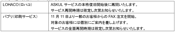 (1)その他の弊社サービスに関する状況は以下のとおりです。(2)ASKUL LOGIST 株式会社の3PL事業におけるお客様企業(株式会社良品計画様ほか)の出荷業務に ついては本リリース記載の復旧スケジュールとは異なります。