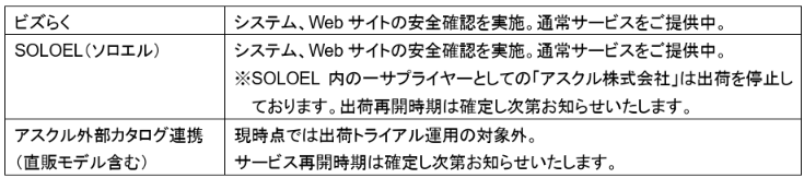 なお、アスクルのサービス内容や影響範囲に関する詳細なご確認は、アスクルお客様サービスデスクまでお願いいたします。