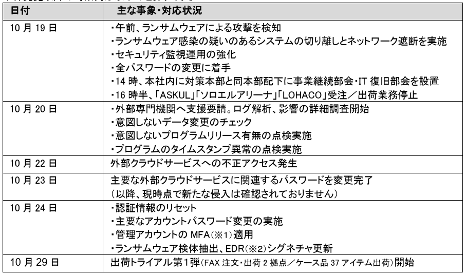 本報告が、当社の説明責任を果たすのみならず、本件に高いご関心をお寄せいただいている企業・組織におけるサイバー攻撃対策の一助となりましたら幸いでございます。1.ランサムウェア攻撃の発生と対応の時系列