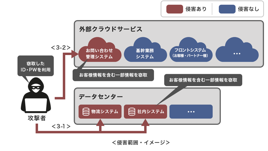 ・当社物流センターは、自動倉庫設備やピッキングシステム等、高度に自動化された構造となっており、その稼働をつかさどる物流システムが停止したことで、物流センターの出荷業務を全面停止する重大な影響を及ぼしました。3-2 外部クラウドサービスへの侵害