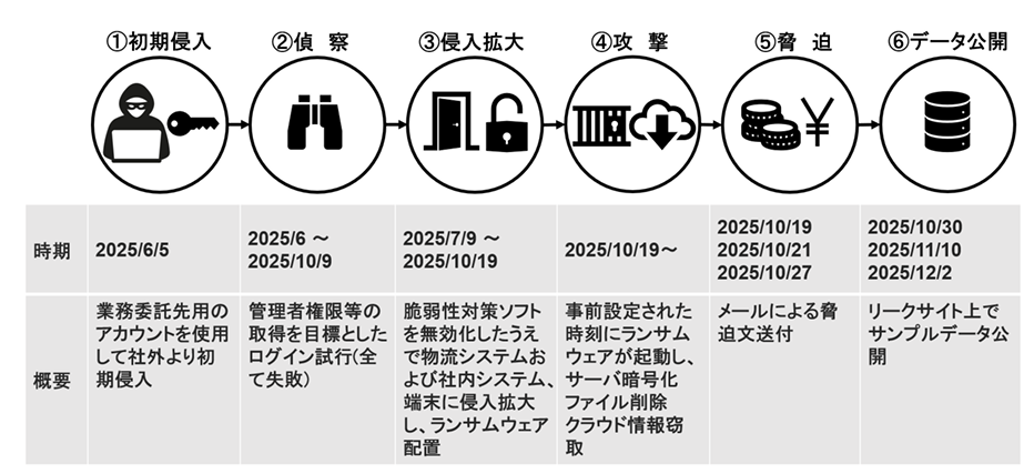 ・物流システム・社内システムでランサムウェアの感染が確認され、一部データ(バックアップデータを含む)が暗号化されて使用不能になるとともに、当該データの一部が攻撃者により窃取され、公開(流出)されました。