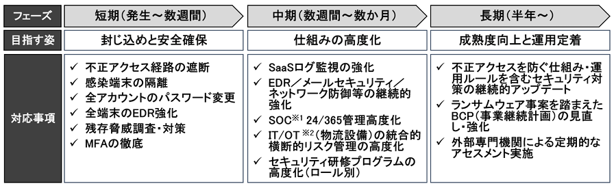 ・中期フェーズでは、監視体制の 24/365 管理高度化、権限管理フレームワークの見直し、従事者に対する教育体系の強化など、運用基盤の強化を重点的に進めています。