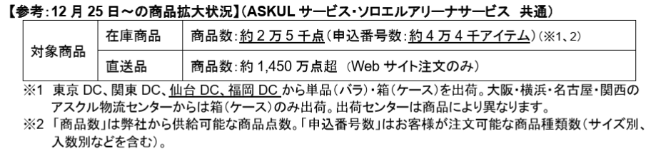 12 月25 日より、ASKUL仙台DCおよびASKUL福岡DCにおいても、物流システムを使用した商品出荷を再開し、単品(バラ)単位でのご注文対象商品が約1万6千商品から約2万5千商品へと拡大しました(12月23日18時よりご注文可能になっております)。