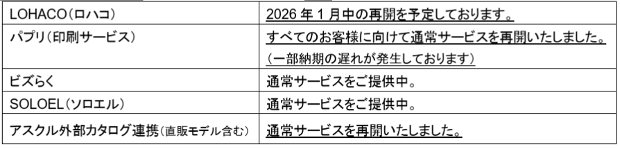 なお、アスクルのサービス内容や影響範囲に関する詳細なご確認は、アスクルお客様サービスデスクまでお願いいたします。
