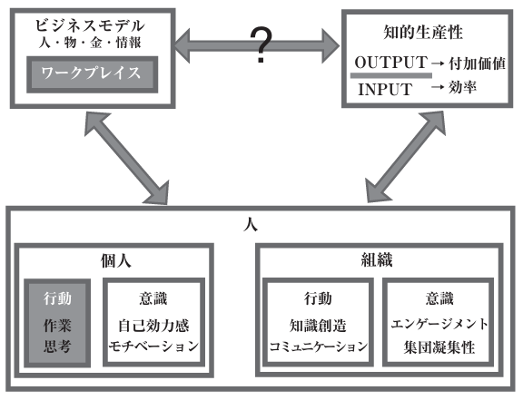 図2でワークプレースと知的生産性の間の矢印に「?」がついているのは、ワークスペースは直接、知的生産性に影響をおよぼすわけではないという仲氏の考えを表しています。