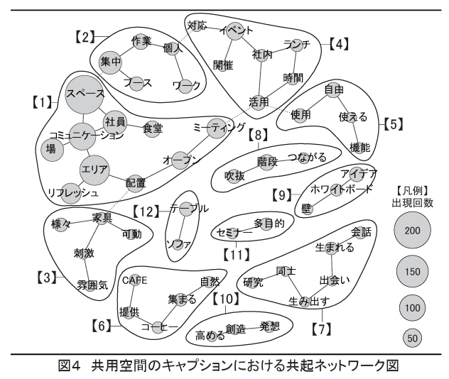 下の図3は、キャプションの分析結果によって描かれたネットワークで、共起していた言葉によって12のサブグラフが抽出されています。