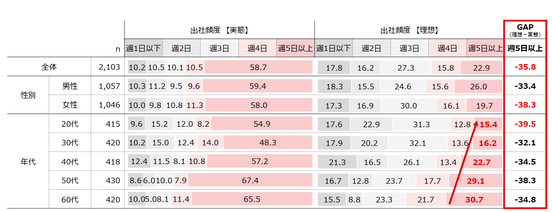 20代では週5日以上出社している割合が54.9%ですが、それを理想とする人はわずか15.4%です。30代では週5日出社している人は48.3%、一方でそれを理想としている人は16.2%となっているなど、若年層ほど実際の出社頻度と本人の理想がかけ離れているのです。