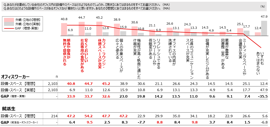 「朝食や間食が無料で提供される」(理想40.8%、実態6.9%)
