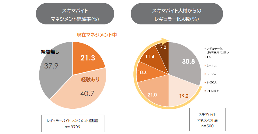 パーソル総合研究所の調査結果を引き続きみていくと、スキマバイトのマネジメント経験がある店長・管理者の7割弱が、スキマバイト人材をレギュラー化したことがある、という結果が得られています。
