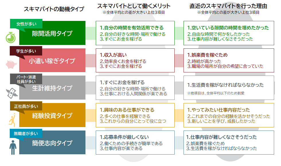 これに基づいてパーソル総合研究所は、スキマバイトの動機を5種類に分類しています。