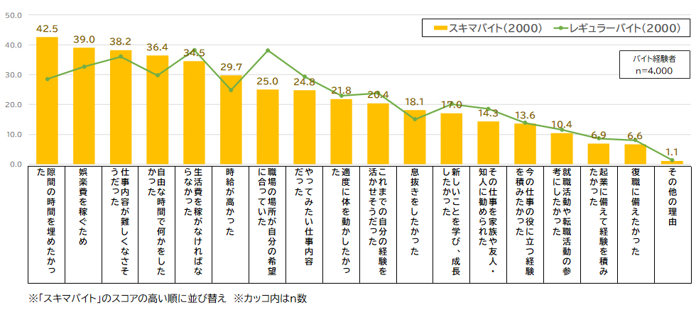 最も多いのは「隙間の時間を埋めたかった(42.5%)」というものです。次いで「娯楽費を稼ぐため(39.0%)」、「仕事内容が難しくなさそう(38.2%)」、「自由な時間で何かをしたかった(36.4%)」が続いています。