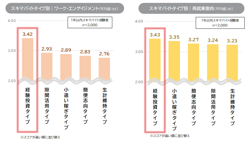 なかでも注目したいのが、正社員が多い「経験投資タイプ」です。自分の経験の幅を広げたいという人が多く、かつワーク・エンゲイジメント、さらには再就職意向が相対的に高い傾向にあります。