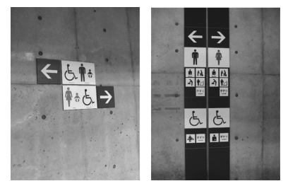 例えば、多機能トイレが設置されても、どの機能がどこにあるかわからなければ使えないため、案内が必要になってきます。東京オリンピック・パラリンピックの施設では、設備機器の情報がピクトグラムで表示され、わかりやすくなっています(図1)。*4