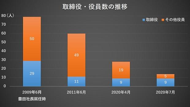 その思いから、豊田会長は社長就任後に、就任時は取締役29名、常務役員50名の合計79名だった体制を、2020年には取締役9名、その他の役員が5名と、役員を計14名まで削減しました。