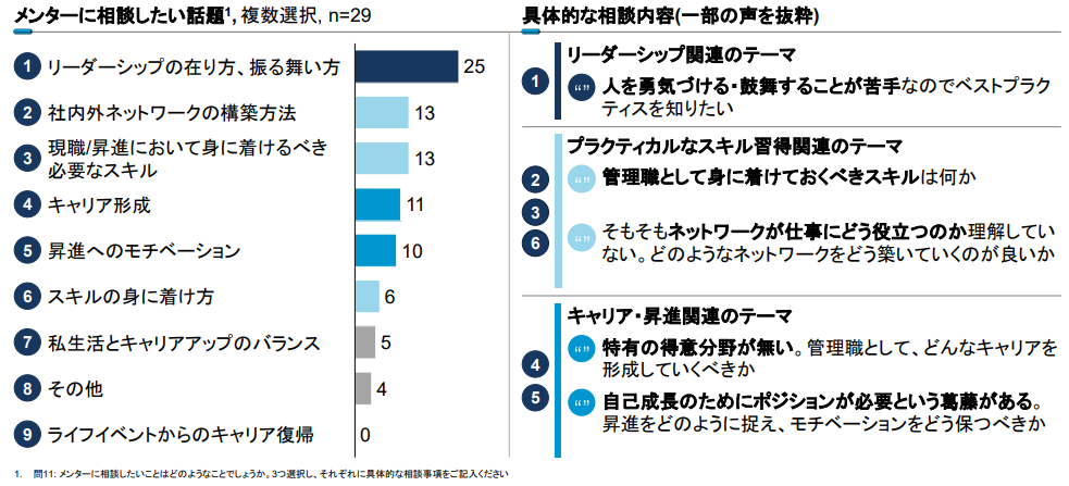 上述の試行プログラムでは、メンティがメンターに相談したい話題は以下のようなものでした(図4)。