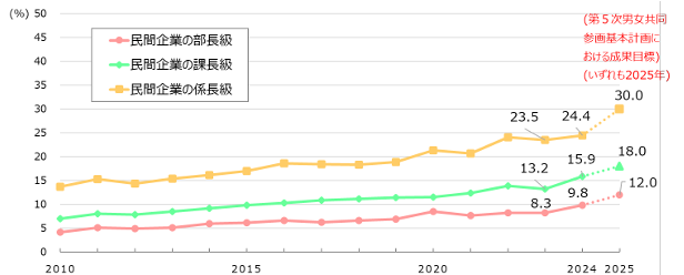 民間企業の管理職に関する2025年の目標値は、部長級が12%、課長級が18%、係長級が30%ですが、2024年時点ではそれぞれ、9.8%、15.9%、24.4%でした(図1)。*2