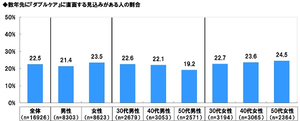 ソニー生命の調査によると、大学生以下の子どもを持つ30歳〜59歳の男女(16,926名)のうち、「数年後にダブルケアに直面する見込みがある」と答えた人の割合は全体の22.5%にのぼっています。