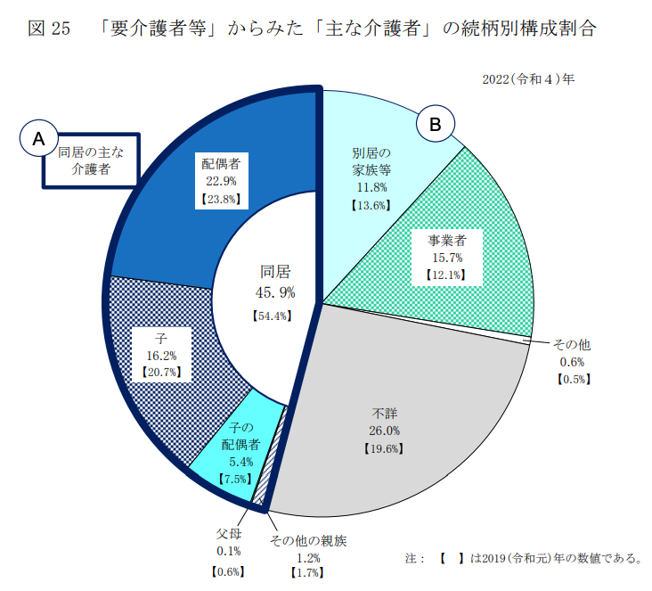 さらに厚生労働省によれば、介護者の約1割は別居の家族、つまり介護のために家族のもとに通う人であることもわかります。