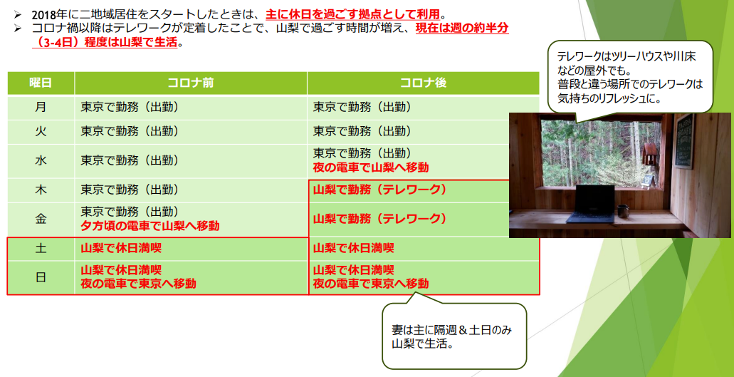 コロナ後のテレワーク浸透により、山梨で過ごす割合が増えています。