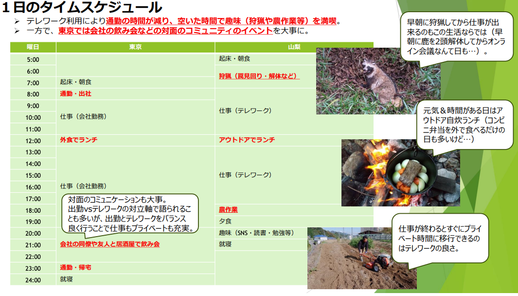 都市部の自宅の他に生活拠点を持ち、仕事に行く時は自宅からのオフィスに通い、そして休暇あるいはフルリモートの日は自然豊かなもう一つの拠点でマイペースで過ごしたり仕事をしたりする。