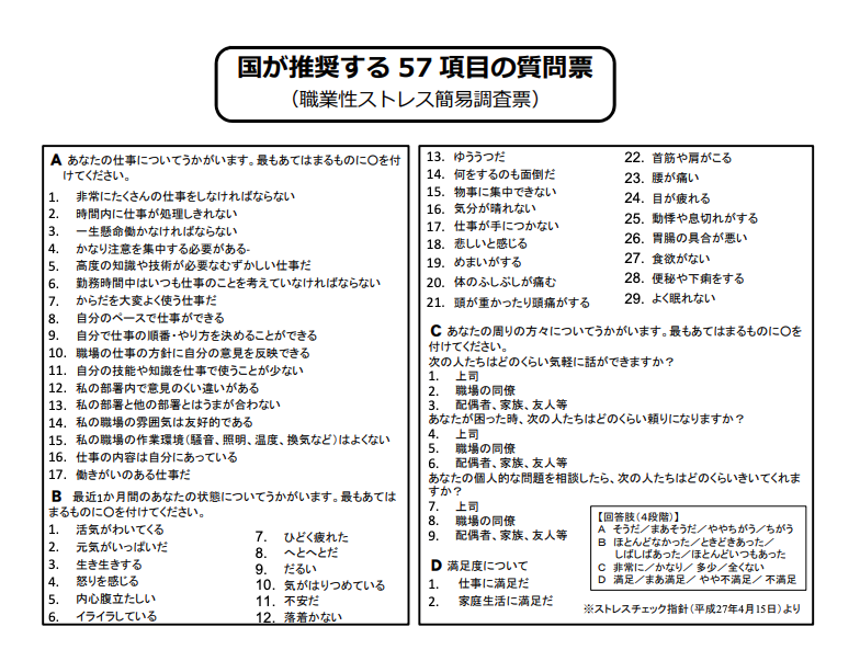 以下のような質問票を用いて、自分のストレスがどのような状態にあるのかを調べる簡単な検査です。*2