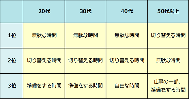 上位にきているのが、「無駄な時間」「切り替える時間」。特に40代までは「無駄な時間」との考えがトップに来ています。