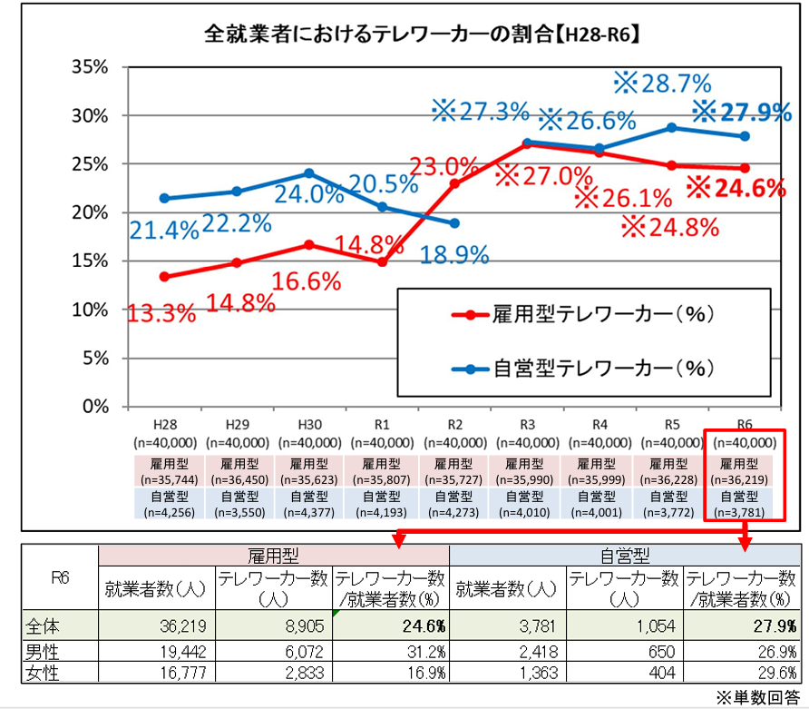国土交通省の調査によれば、2024年(令和6年)の雇用型テレワーカーの割合は24.6%、自営型テレワーカーの割合は27.9%です。いずれも前年度からわずかに減少しているものの、コロナ禍を経てテレワークは一般的になりました(図1)。*1