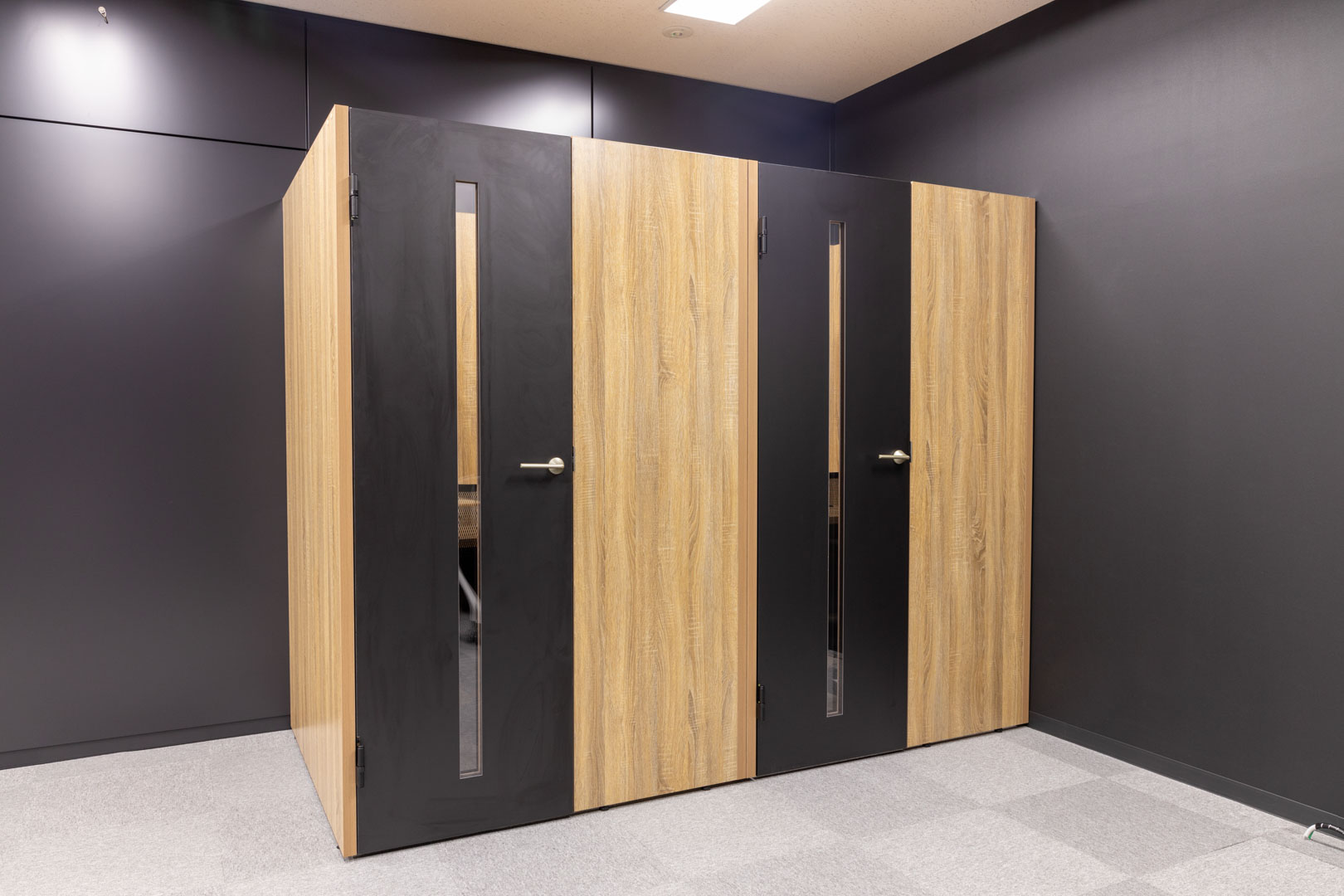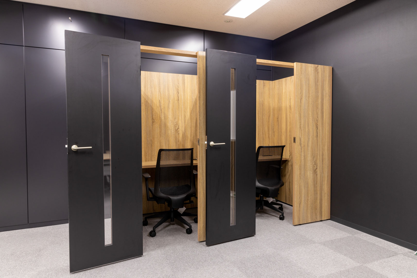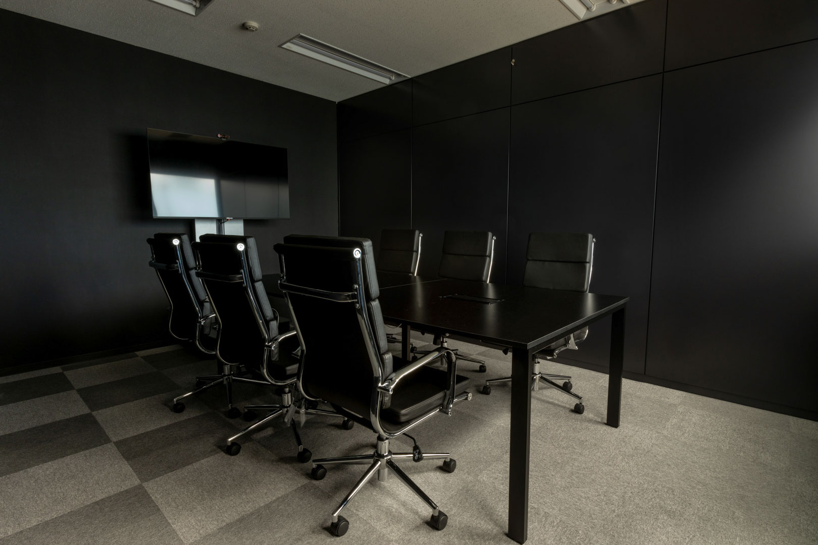 入口から執務室が直接見えない動線計画と企業ロゴを活用した演出により、来訪者に期待感と信頼感を与えるブランド発信空間を構築。