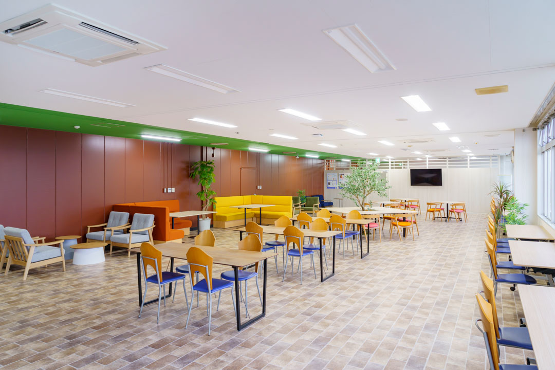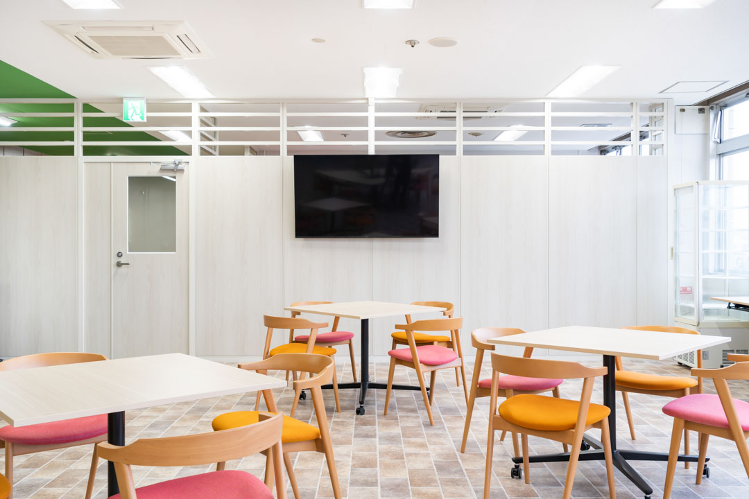 休憩・中継・交流を担う場として再設計。部署が自然に集まり、コミュニケーションやイベントが生まれる“明るく楽しい職場”を狙う。