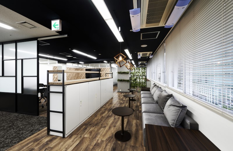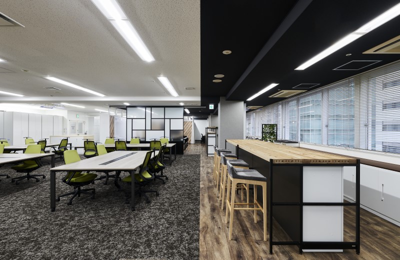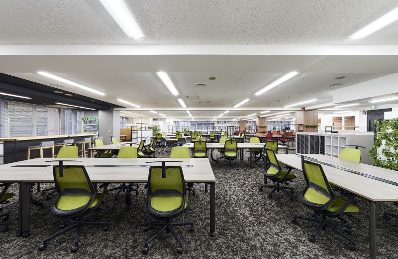 2フロアを1フロアに集約しフリーアドレスを採用。執務、打合せ、研修、休憩など各スペースの役割を明確化し、自然と使い分けが進む設計で部門横断の交流を創出。