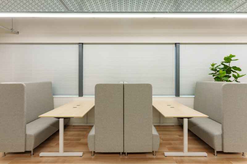 部門ごとの働きやすさを担保しつつ、フリーアドレス要素も取り入れたミックス運用へ。コミュニケーションが起きやすいレイアウトと家具選定で、新しい働き方への移行を後押し。