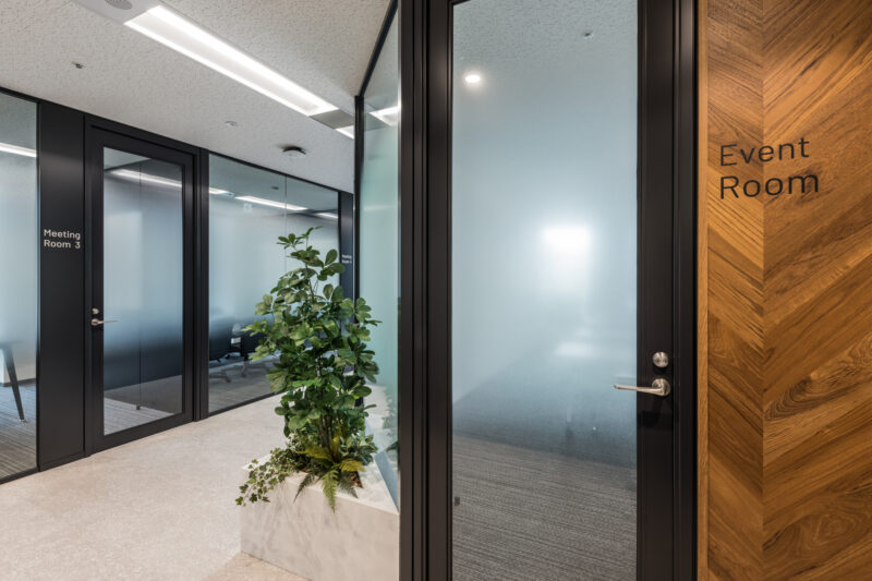 カラーリングで全体を明るくし、窓面を活かしたレイアウトへ。会議室にガラスを活用して外光を取り込み、緑を多く配置することで、出社したくなる体験価値を設計。