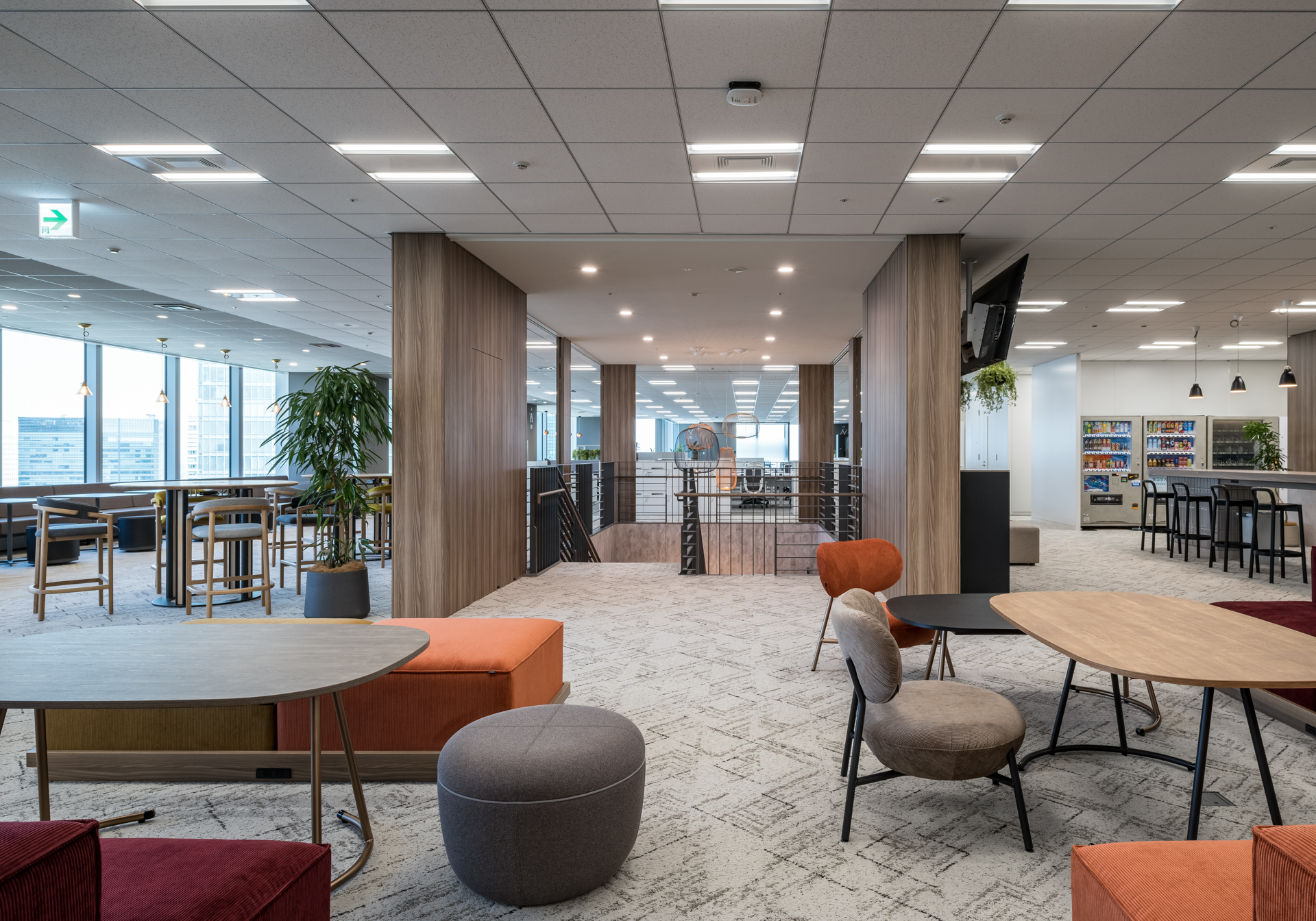 6フロアを2フロアに集約し、上下階をつなぐ階段で日常的な接触を促進。窓際をコミュニケーションスペースとして全面開放しオープンで明るい印象のオフィスに。
