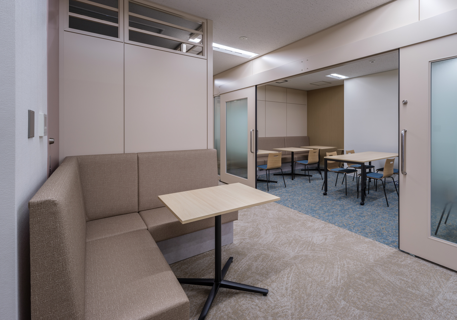 引き戸で開放可能な大会議室を設け、通常はフリーワーク、必要時は大会議室として活用可能に。