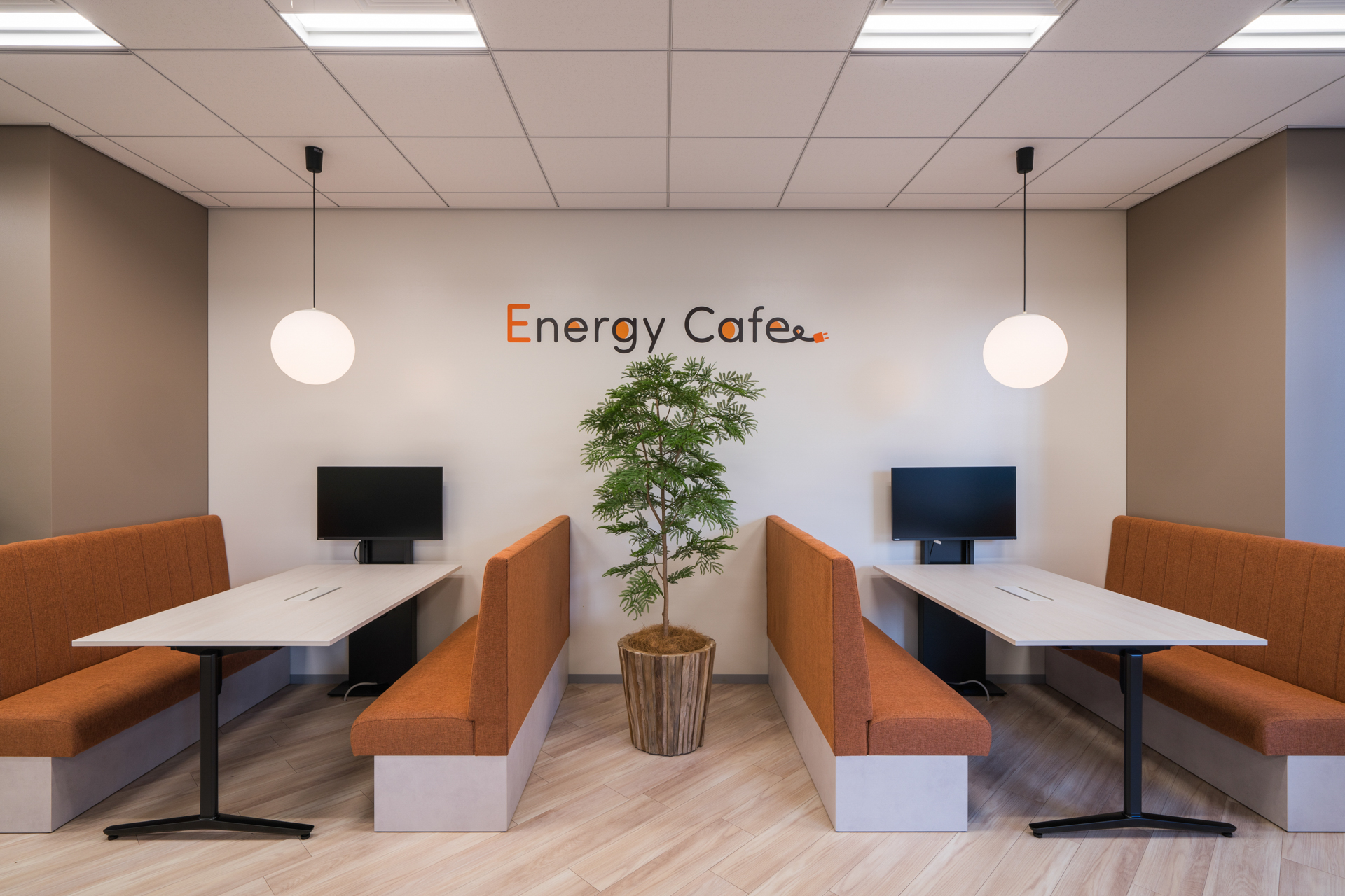 全体の大きな面積をリフレッシュスペースに充当。カフェ機能や飲料提供など福利厚生と空間を一体化し、オンオフの切替と自然な対話が生まれる環境を構築した。