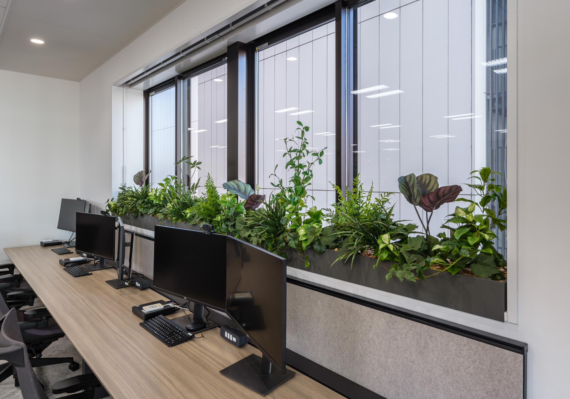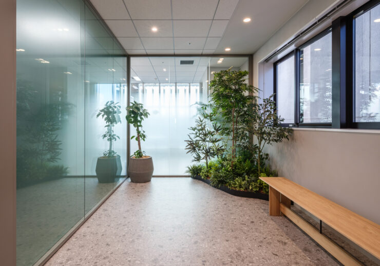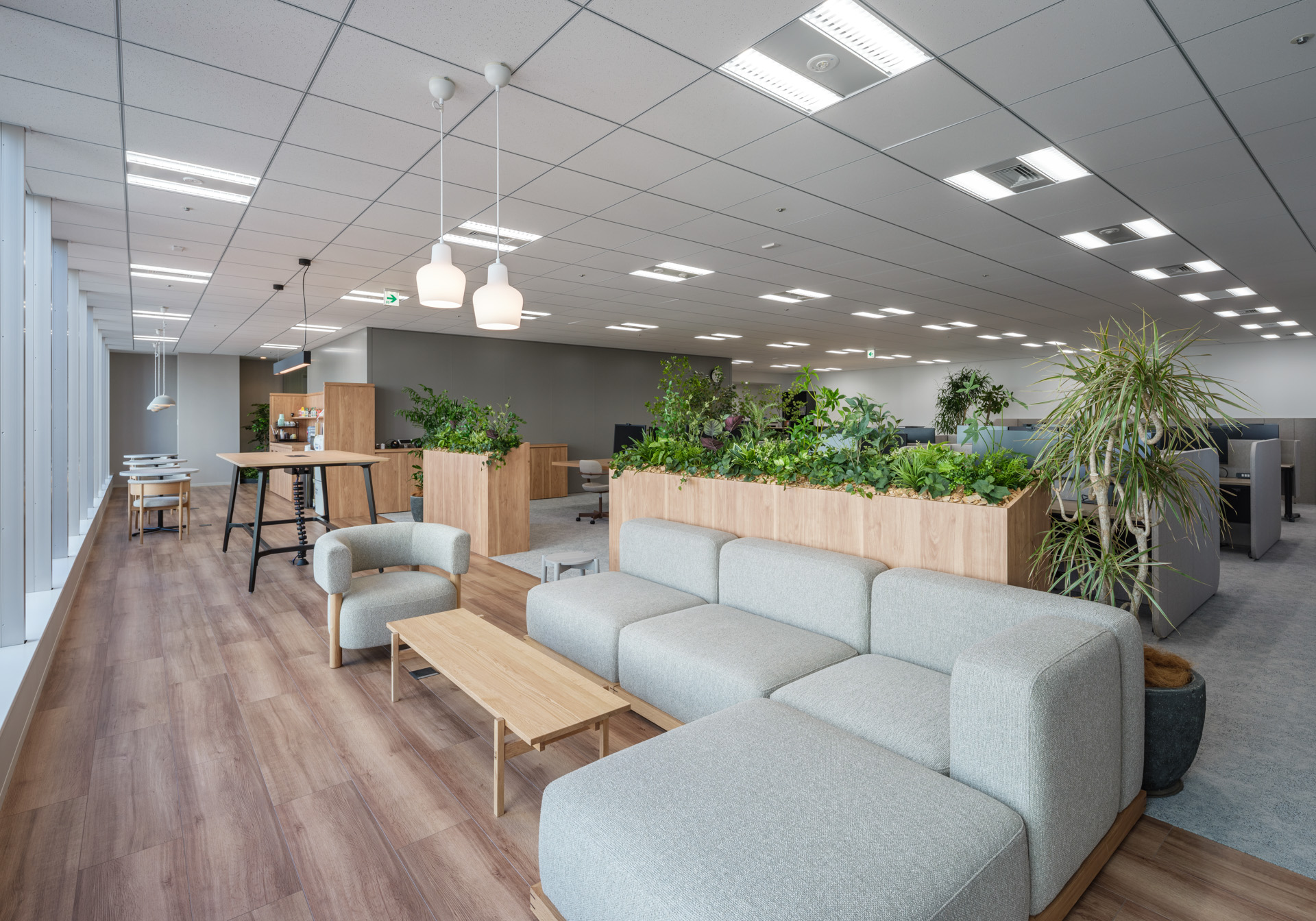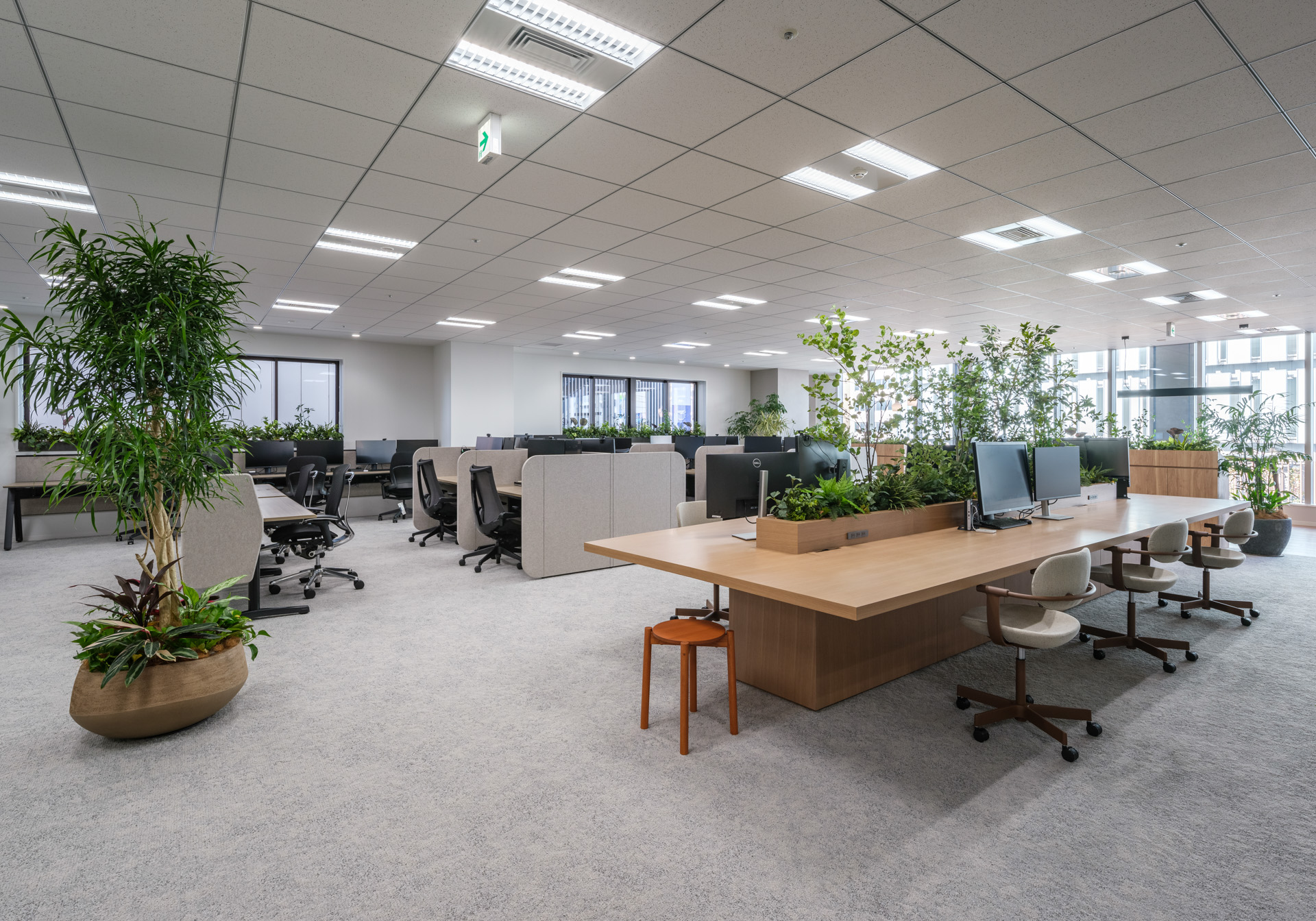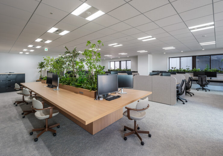 ガラス面と眺望を活かしつつ、ワークスペースを広く確保。昇降席・植栽ビッグテーブル・囲まれ席・窓際など、84坪でも“選べる場”を設計。