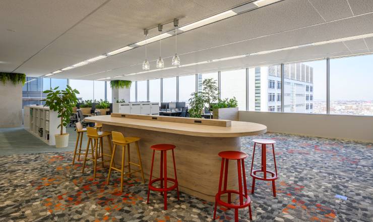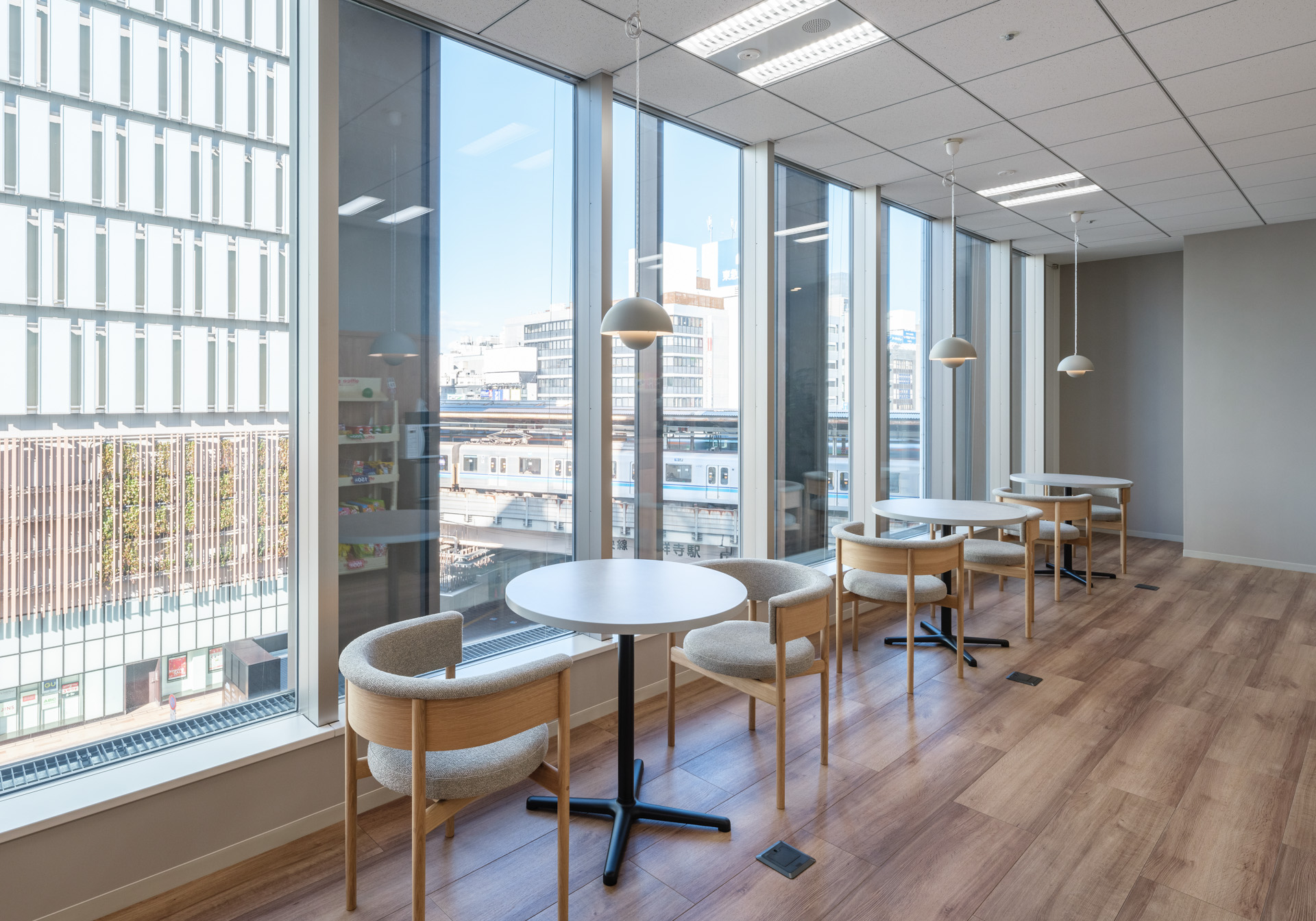 急な移転制約下でも、働く場所の選択肢と快適性を確保。眺望を活かした窓際コミュニケーションと、住まいのような落ち着きで、出社価値を高めた。