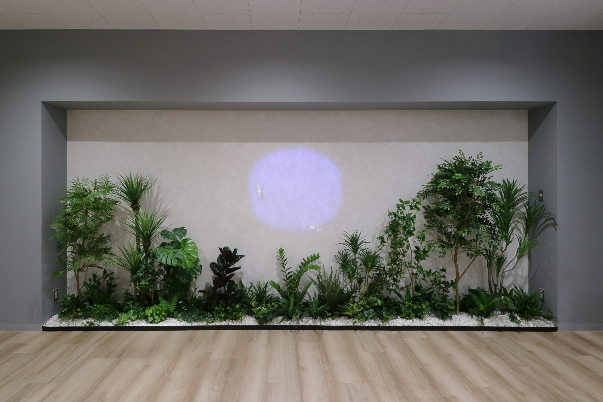 庭園を眺める植栽計画と木質感の仕上げに、プロジェクター投影(木漏れ日/ウェルカム表示)と音も掛け合わせ、待ち時間を“落ち着ける時間”へ転換。
