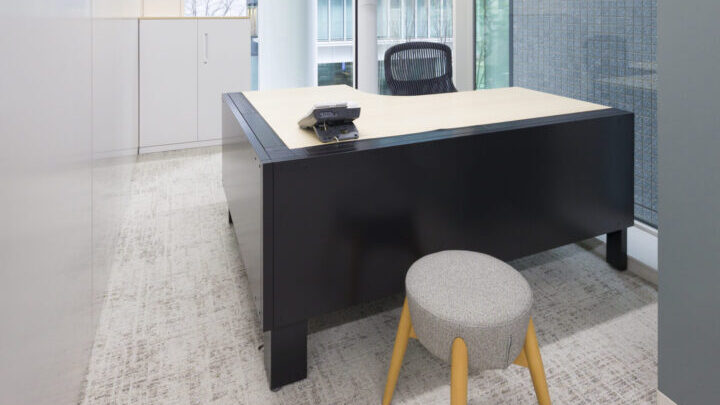 固定席を廃し、90度デスクやビッグテーブルを組み合わせたグループアドレスを採用。営業の外出頻度や将来のフリーアドレス化も見据え、座席効率と働き方の選択肢を両立させた